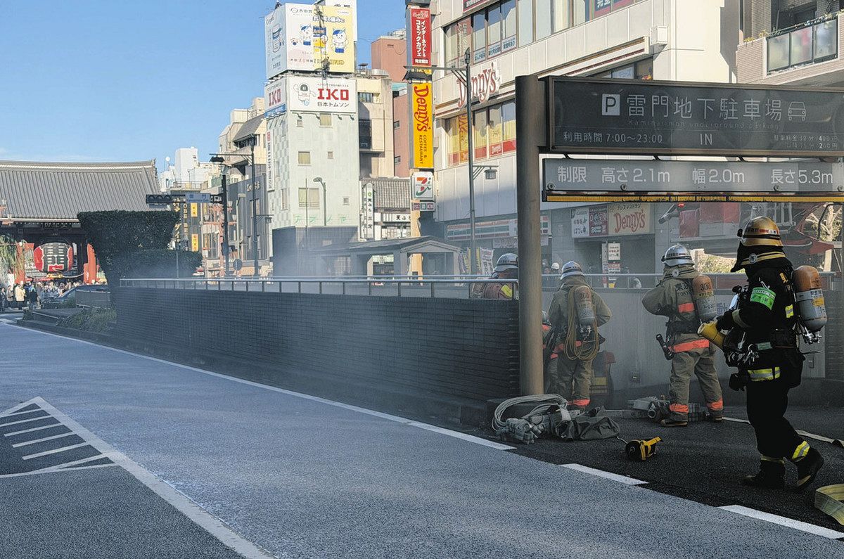 現場は国内屈指の観光地として知られる浅草寺・雷門の目の前。駐車場入り口からは白煙が上がり、一帯にはゴムの焼けたよう...